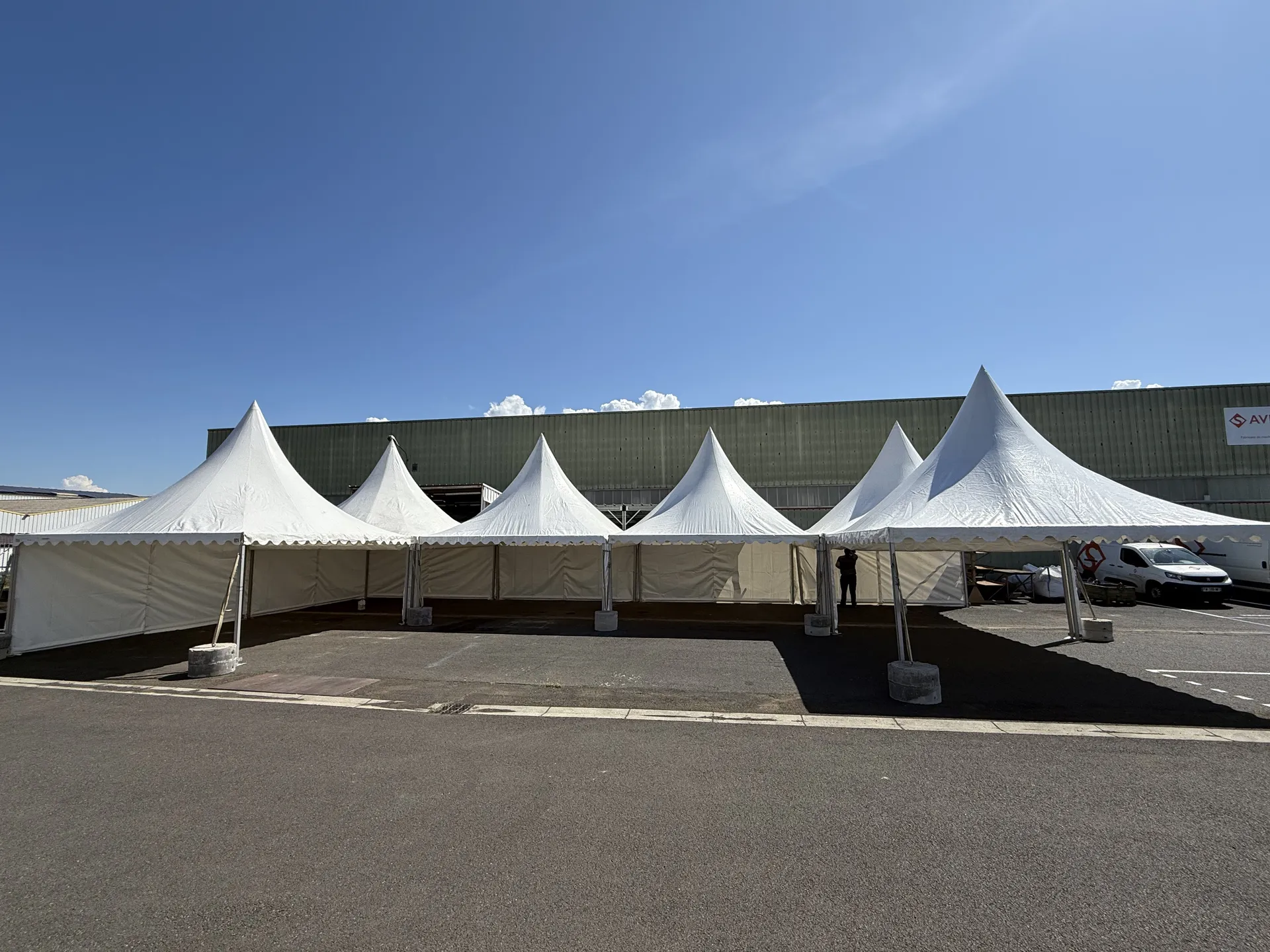 Avec Velay Réception, la location de pagodes pour une fête d'entreprise à Brioude entre le Puy en Velay et Clermont Ferrand repose sur une mise en œuvre précise. Configuration comprenant la location de 6 pagodes de 5/5m, jointes par des systèmes de gouttières étanches, garantissant une continuité parfaite face aux aléas climatiques en Auvergne. L’ensemble est lesté par des plots béton assurant stabilité et sécurité. Installation sous forme de U, optimisant la circulation des convives et la structuration des espaces.