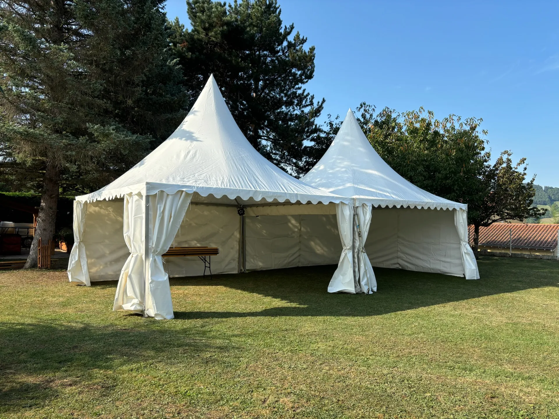 Organisation optimisée avec la location de 2 pagodes pour un baptême de 40 personnes tout près du Puy en Velay. Structures jumelées étanches, éclairage LED, tables adaptées. Solution technique pour réception extérieure maîtrisée au Puy en velay et ses a...